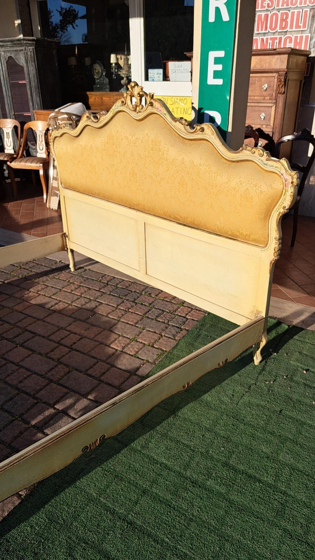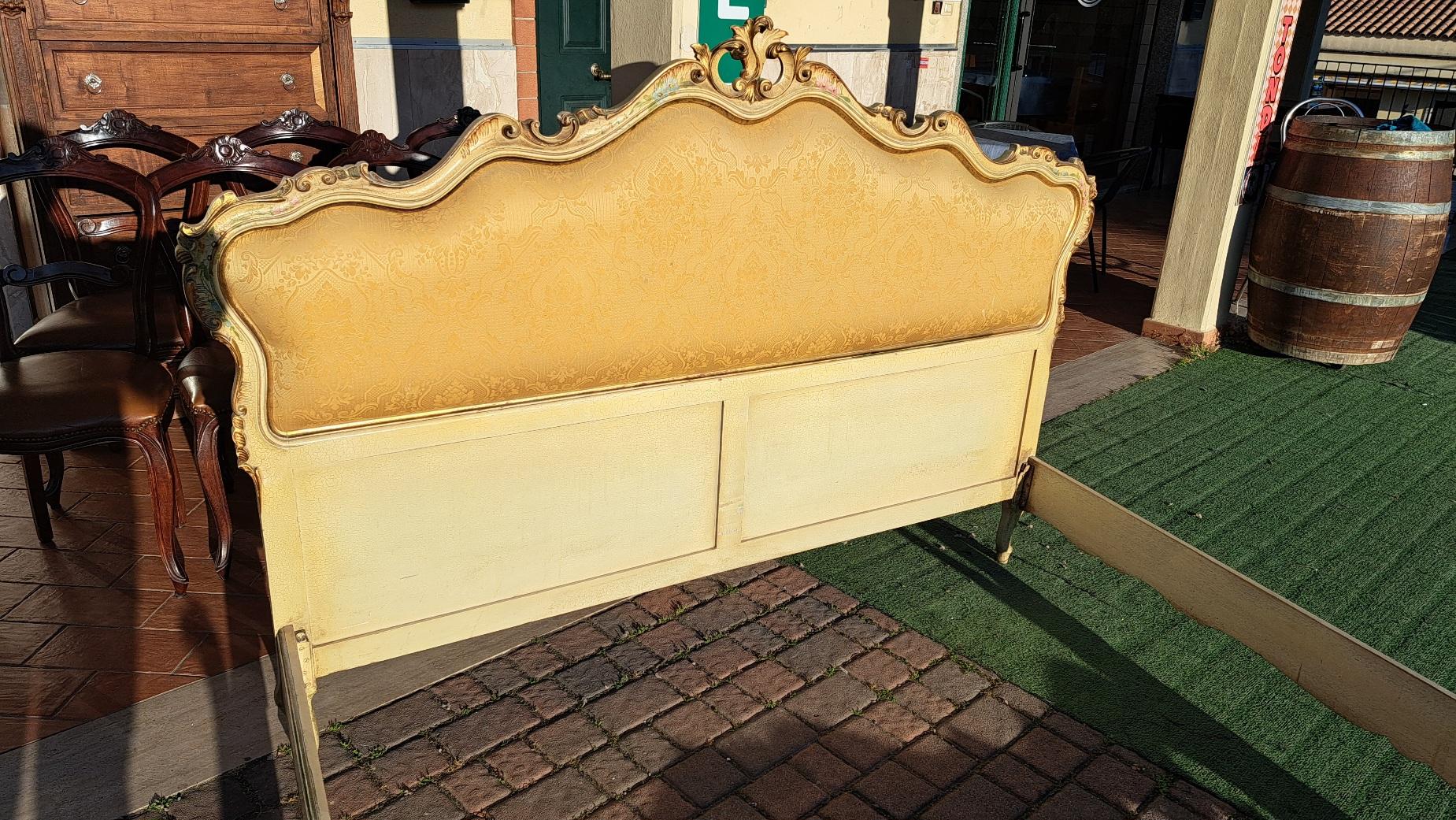 Letto matrimoniale anni 60 barocchetto veneziano.  La struttura in legno è color avorio con finiture oro, ed è riccamente decorata con motivi floreali. La testata presenta una tappezzeria in tessuto giallo oro in ottime condizioni. Misura rete standard