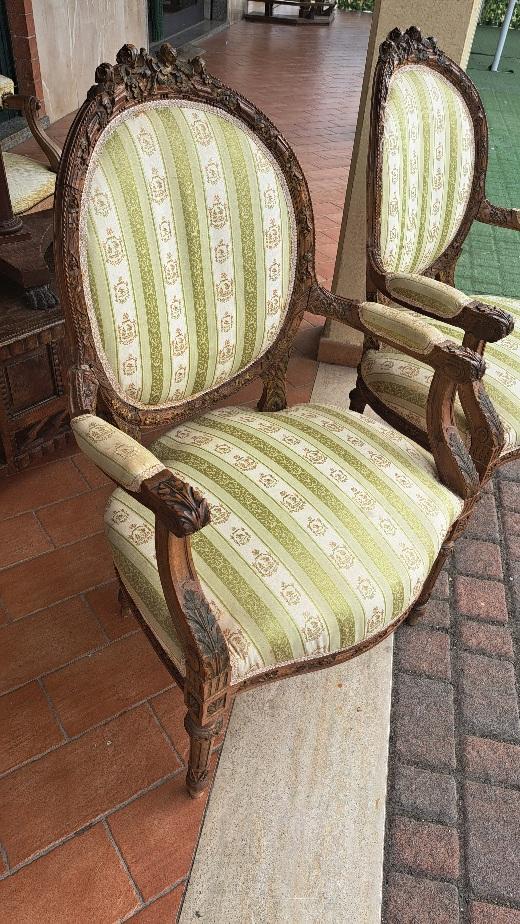 Coppia di poltrone francesi stile Luigi XVI seconda metà 800 in noce, schienale a medaglione e braccioli a giorno.