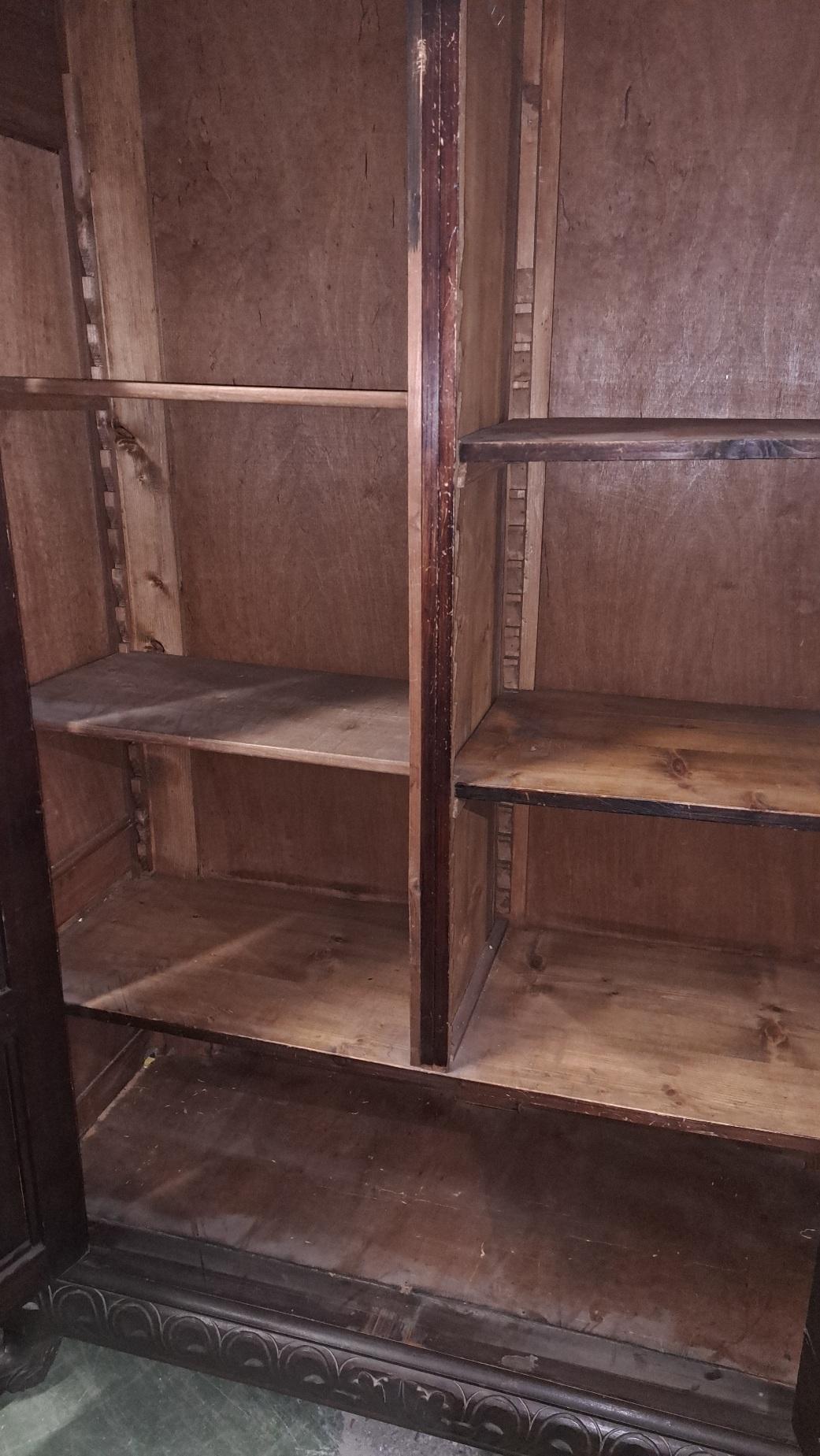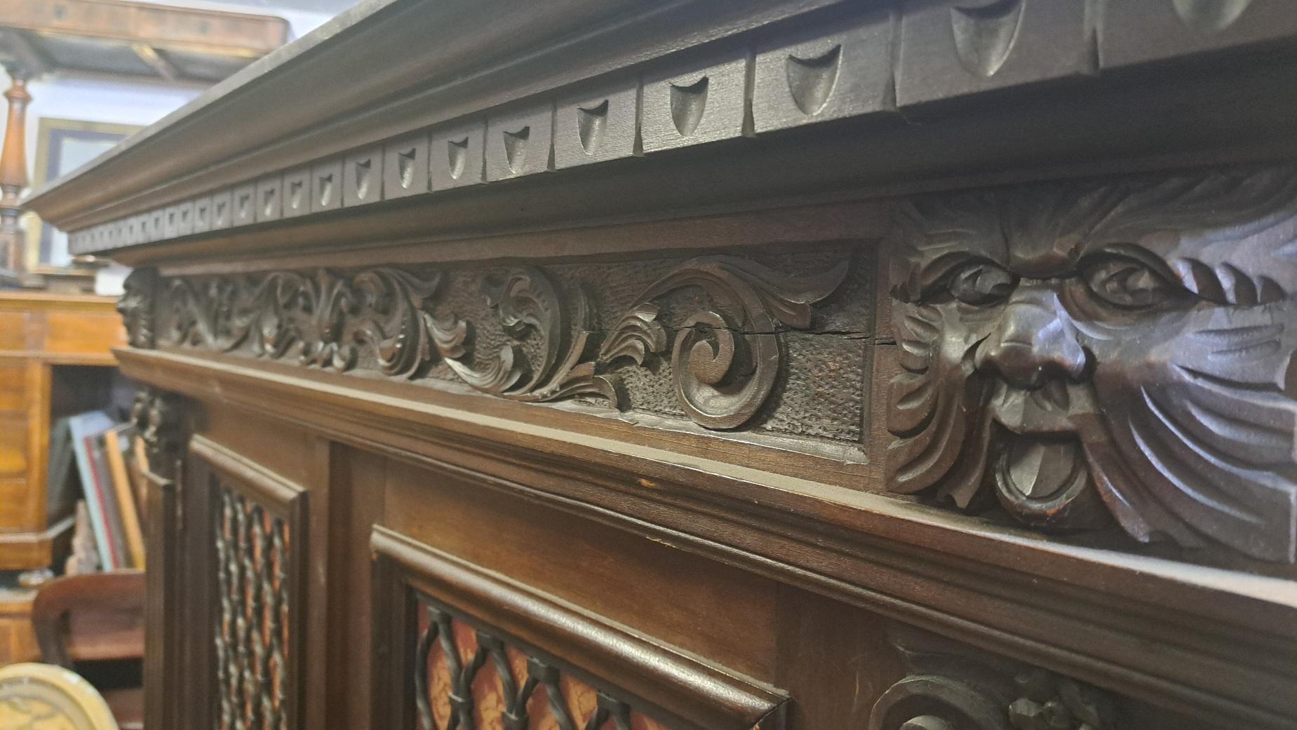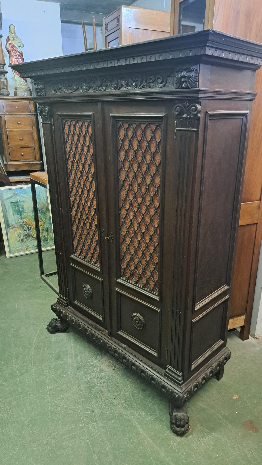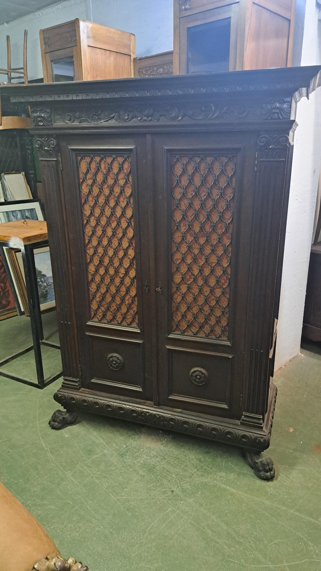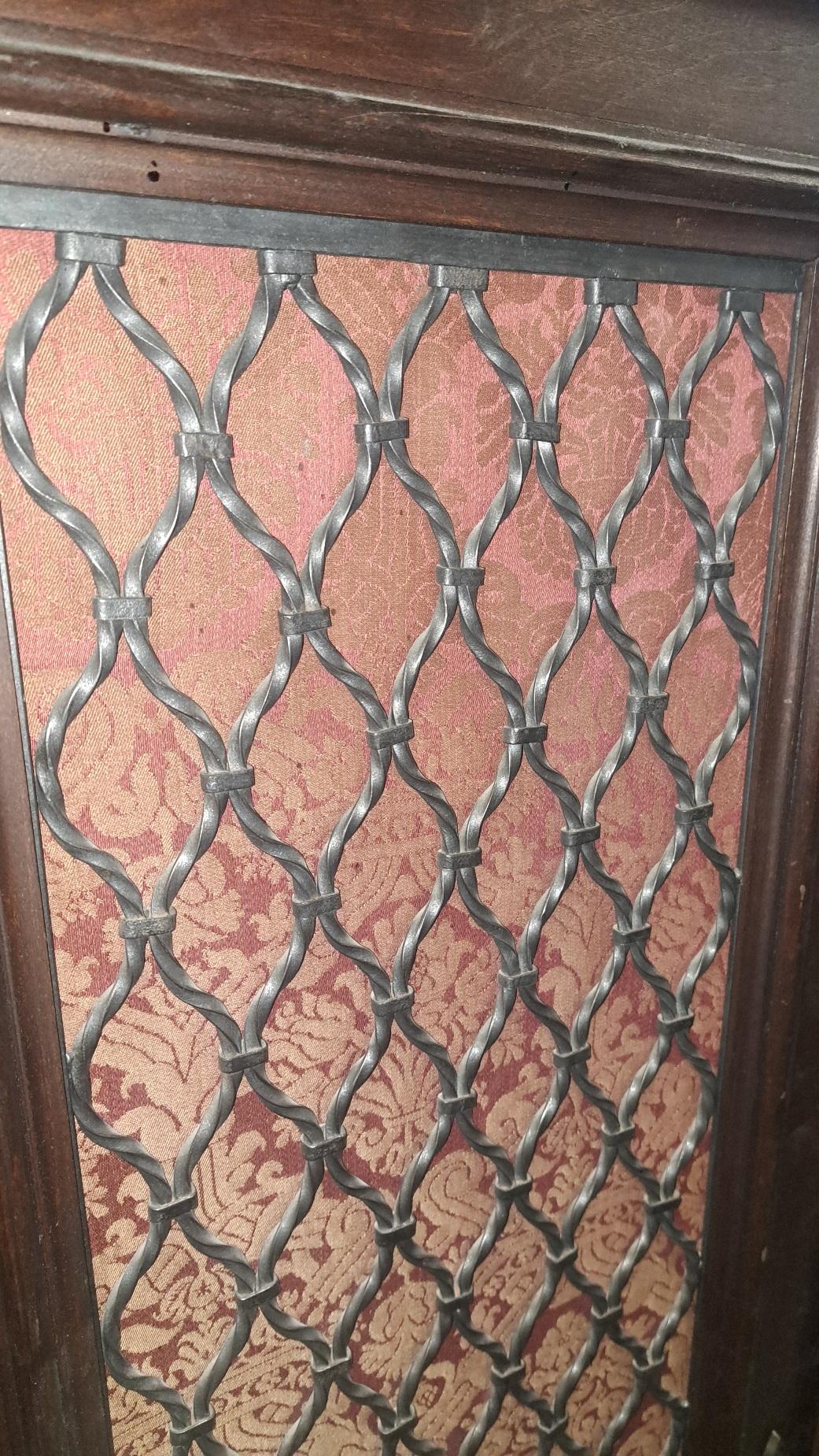 Il mobile presenta 2 ante con griglia in ferro battuto con tessuto rosso damascato