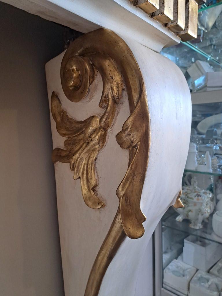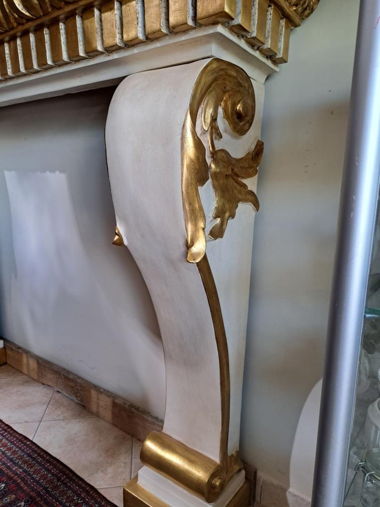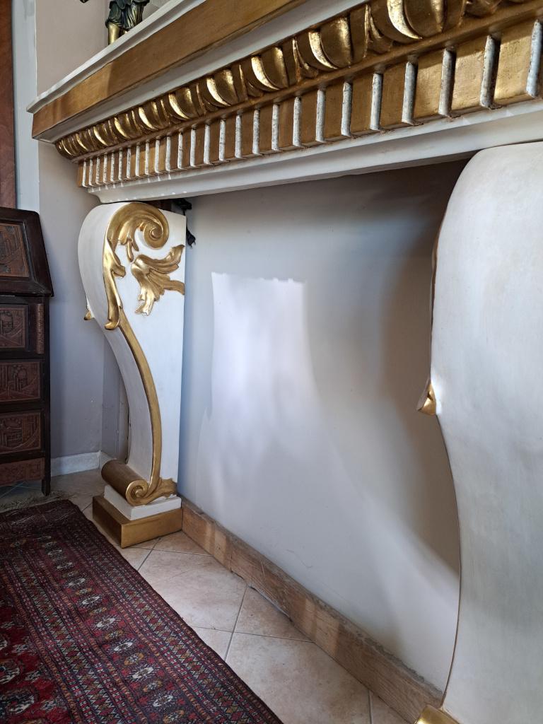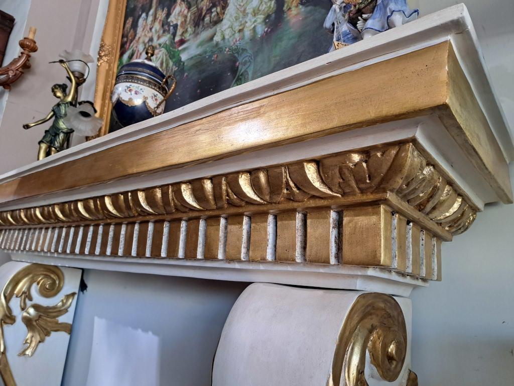 Cornice da camino italiana fine 600 completamente originale. Lacca color avorio decorazioni in foglia d oro pezzo unico e di grande impatto visivo. Misura 190x40 misura bocce 110x110. Sulla parte alta verrà posizionato un piano in marmo