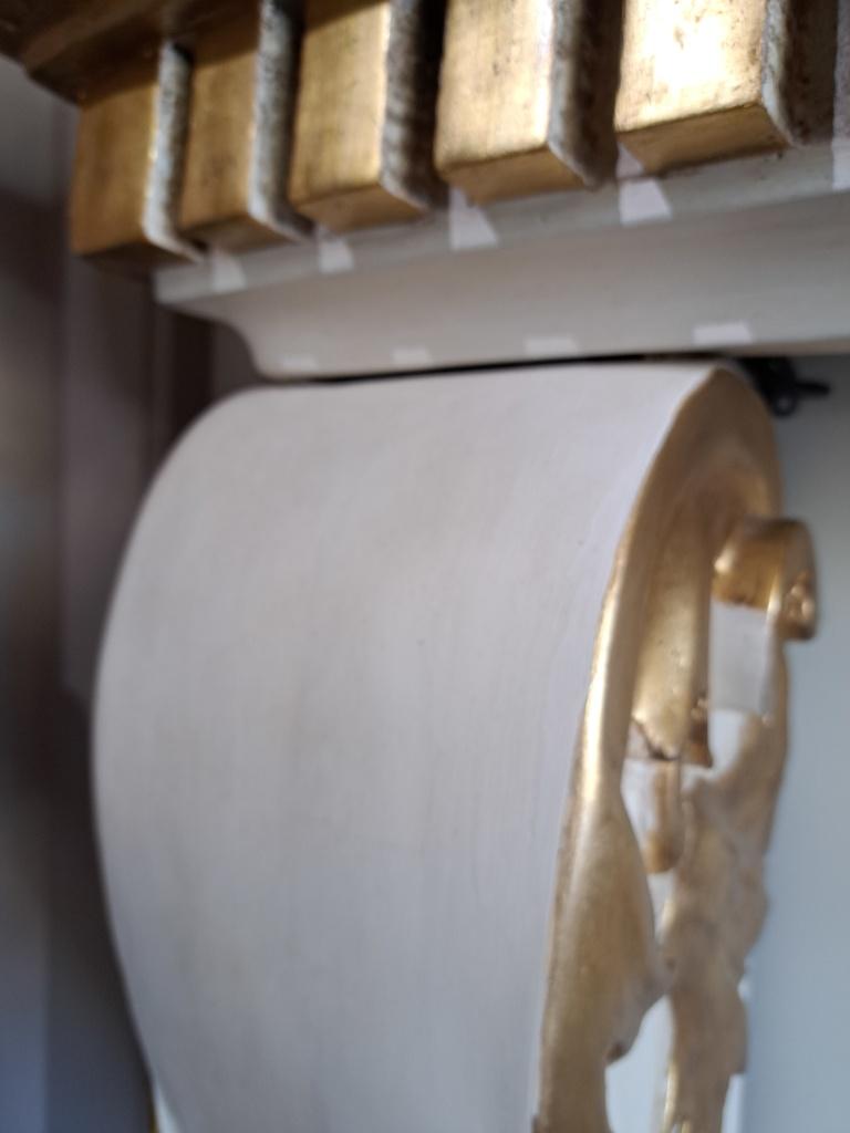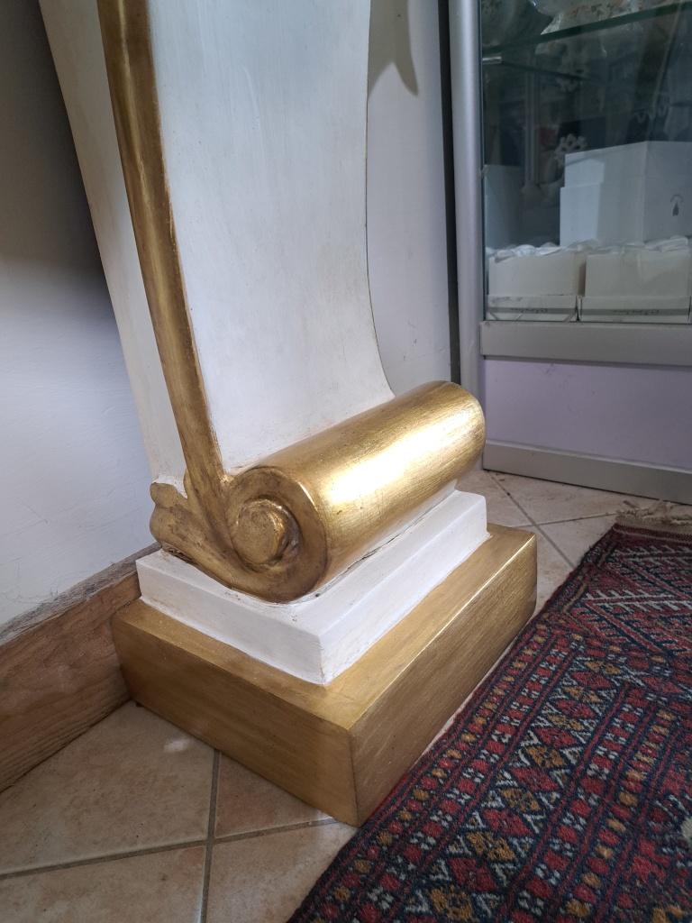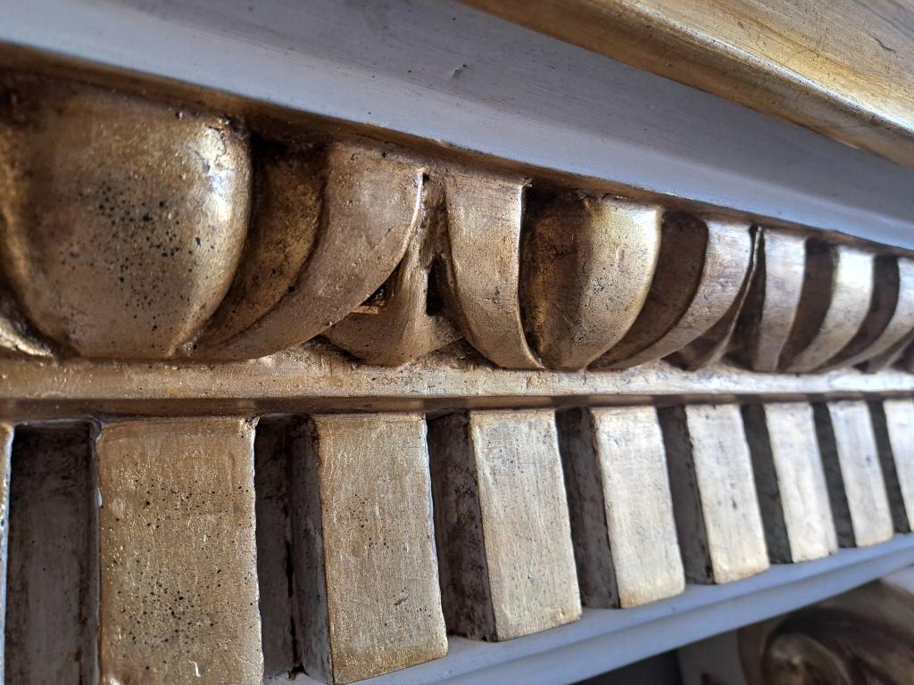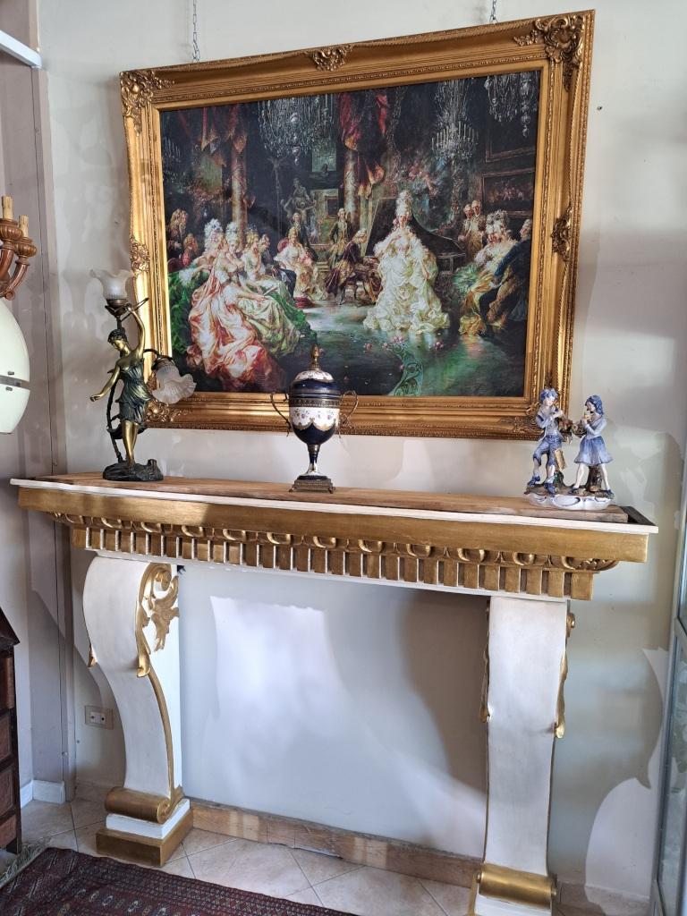 Cornice da camino italiana fine 600 completamente originale. Lacca color avorio decorazioni in foglia d oro pezzo unico e di grande impatto visivo. Misura 190x40 misura bocce 110x110. Sulla parte alta verrà posizionato un piano in marmo