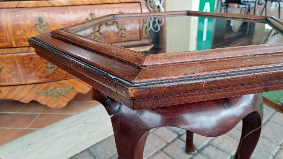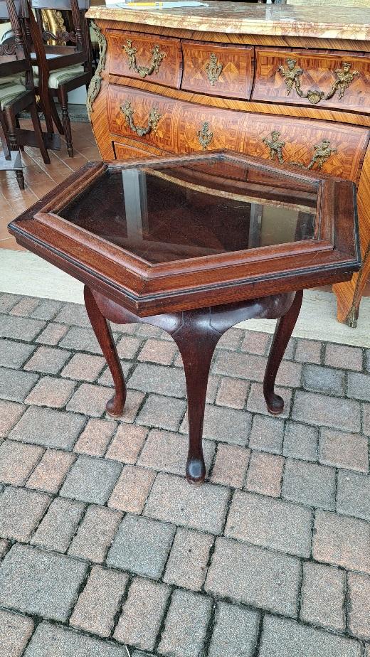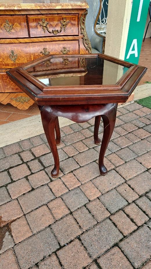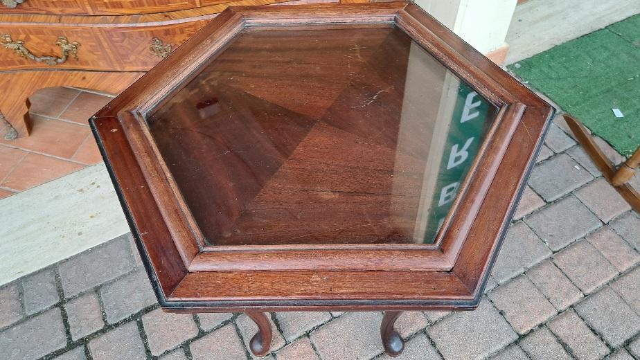 Tavolinetto inglese di forma esagonale piano in vetro apribile con un piccolo vano contenitore altro 3cm mobile in ottime condizioni misura 65x65 altezza 65