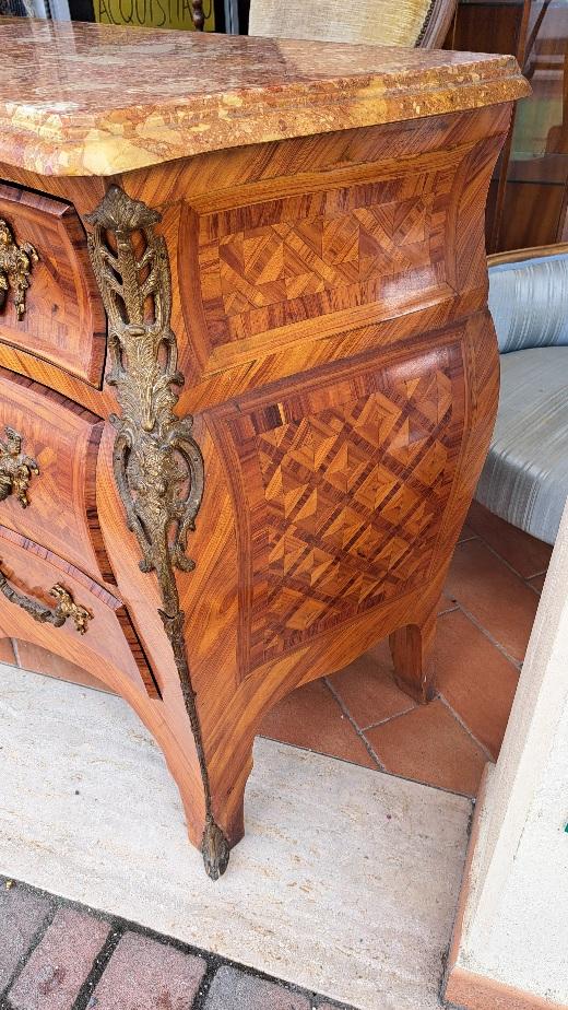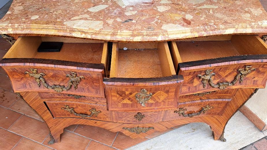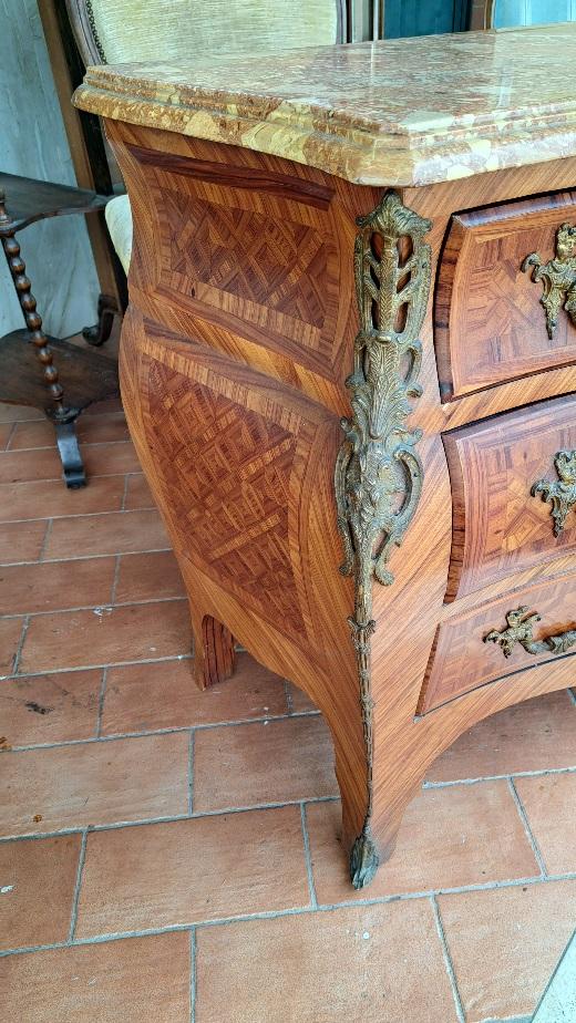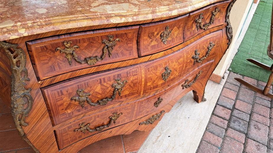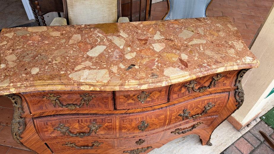 Como' francese in stile Luigi XV in legno di rosa 2 grandi cassetti e 3 piccoli superiori piano in marmo, decorazioni in bronzo e maniglieria originale ottime condizioni misura 135x50 altezza piano 88