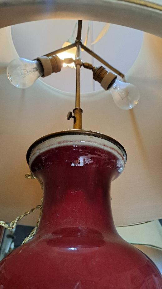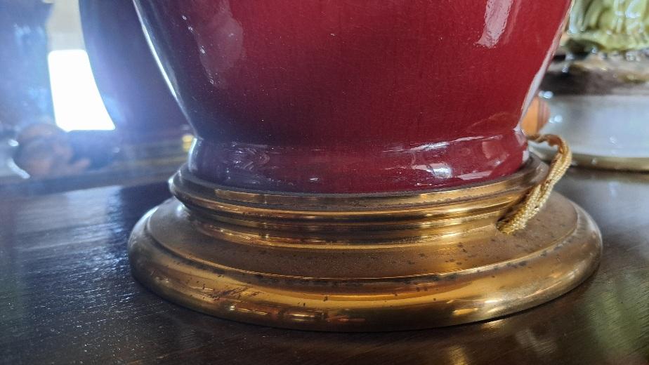 Lampada in ceramica bordeaux anni 70 con base e struttura lampade in ottone, la lampada è in ottime condizioni non presenta difetti. Altezza 85 diametro 48