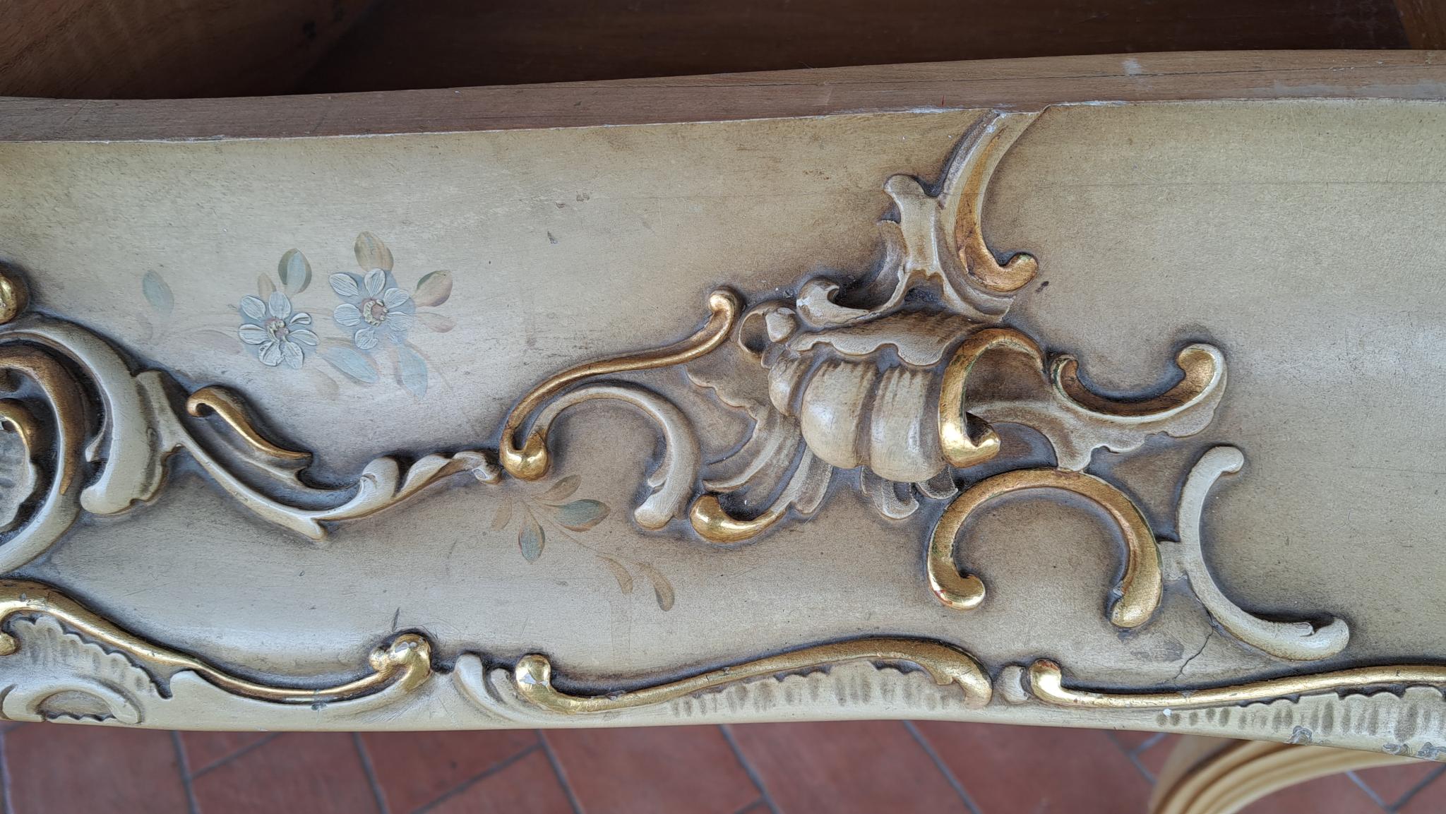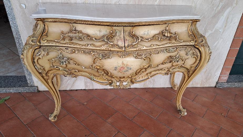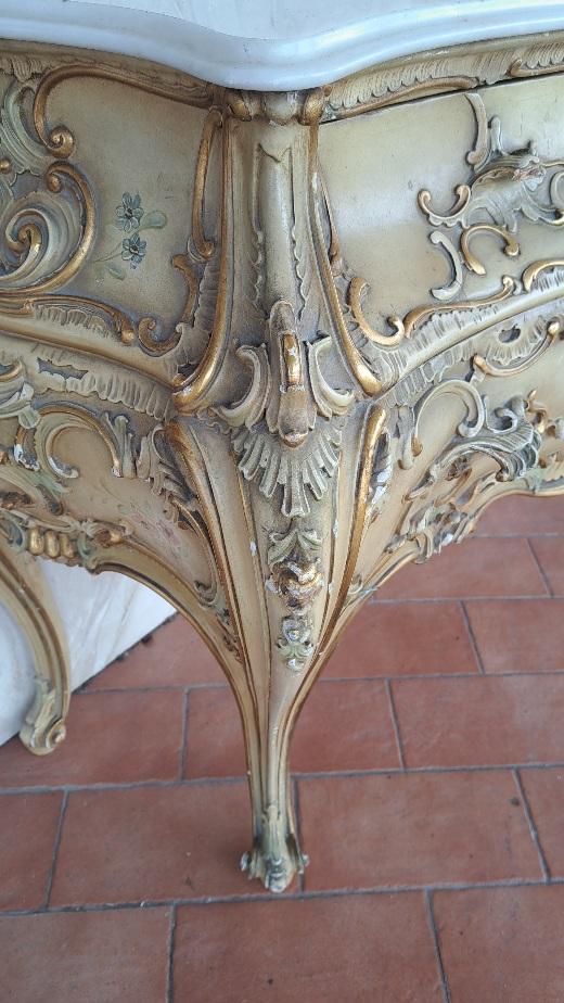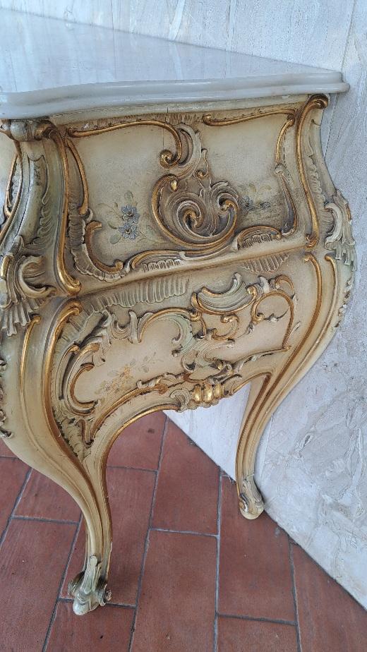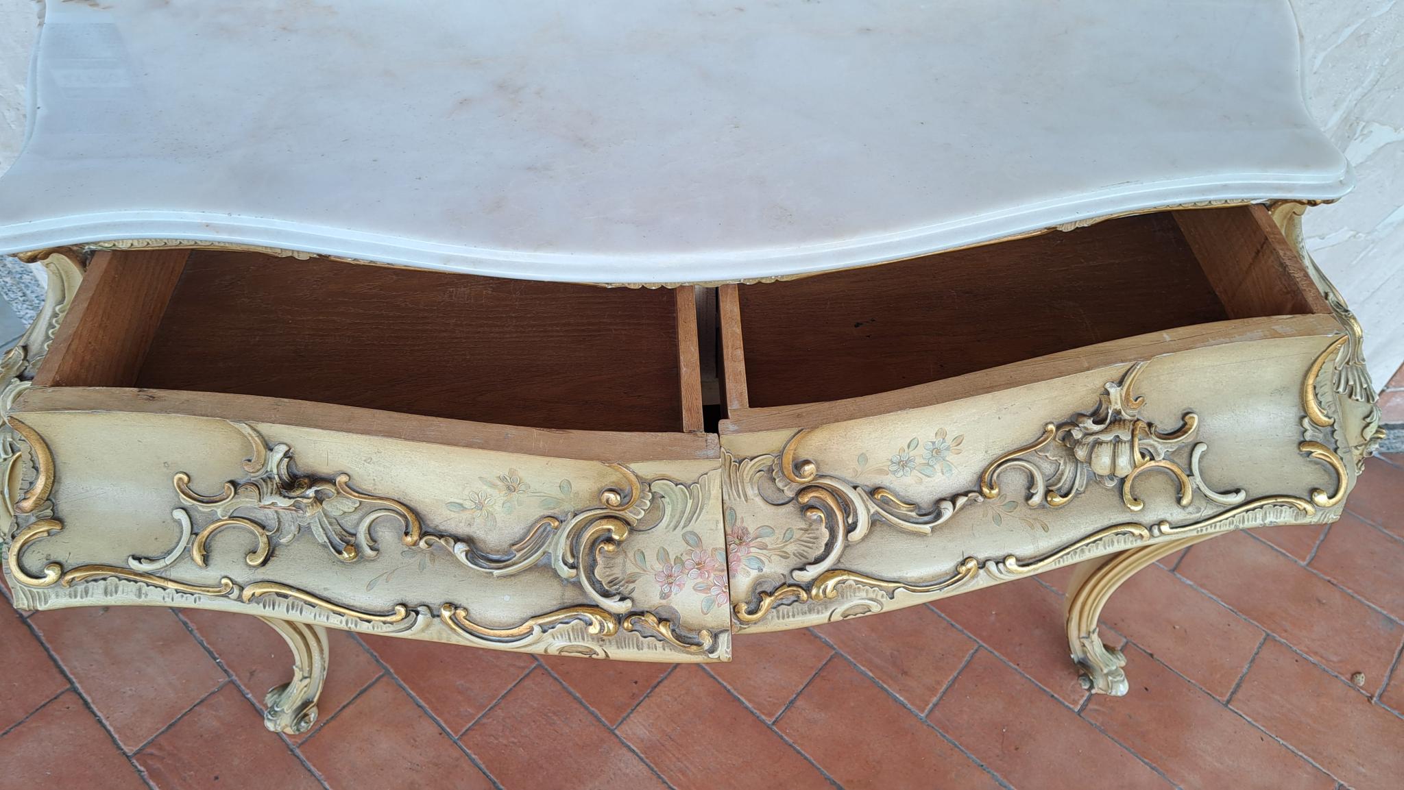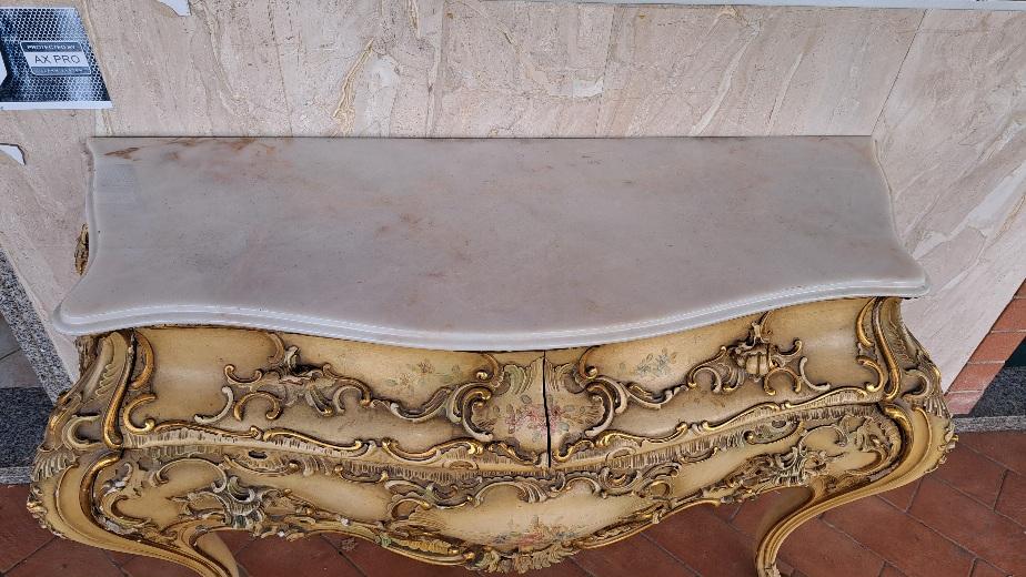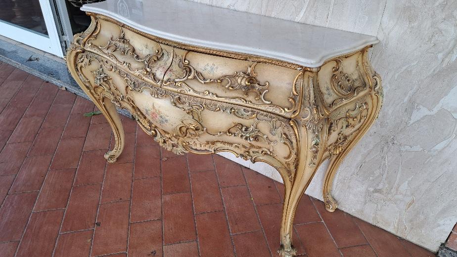 Como' anni 60 barocco veneziano in lacca avorio con decorazioni, piano in marmo bianco ottime condizioni misura 140x48 altezza 88