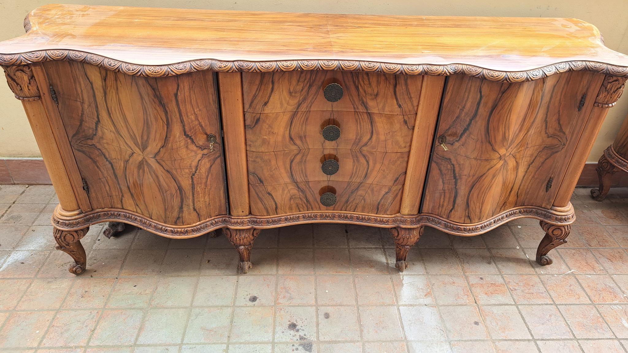 Coppia di servanti stile chippendale produzione anni 50 in noce nazionale 1 ha 3 ante e l altra 2 ante e 4 cassetti montanti e cornici finamente intagliati. Possibilità di abbinare le specchiere dello stesso stile .MIsura 207x58 altezza piano 88 Maniglieria originale ottime condizioni PREZZO RIFERITO A UNA SERVANTE VENDIBILI ANCHE SEPARATAMENTE
