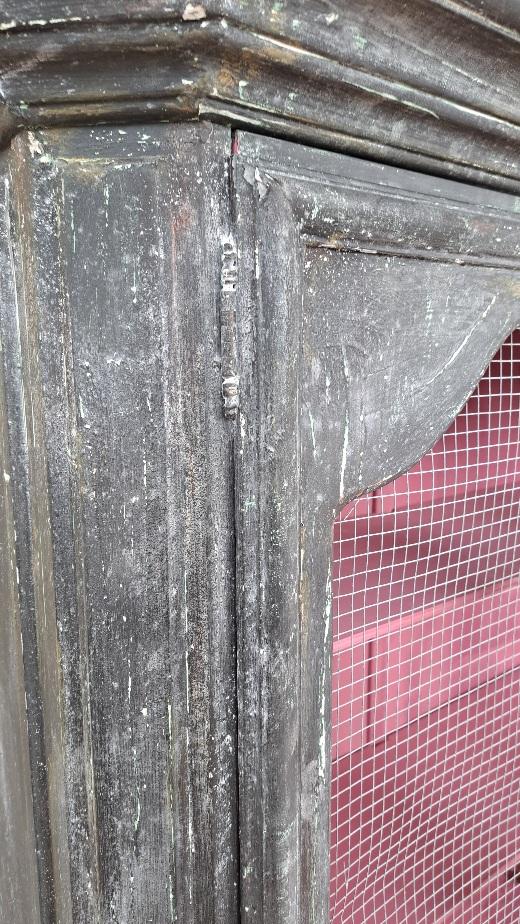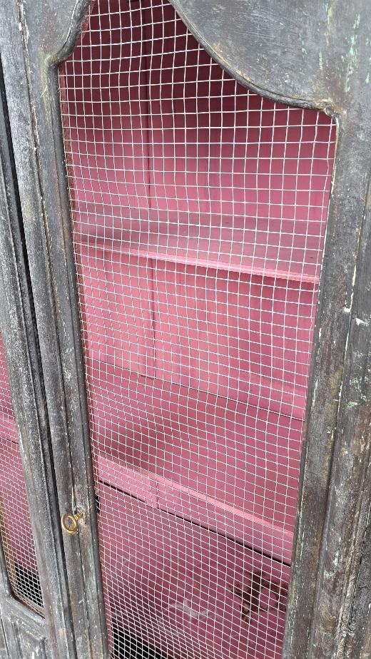 Vetrinetta shabby nera opaca decorata con tecnica a sabbia rete metallica sulle ante ad esaltare il contenuto e il colore acceso interno misura 155x53 altezza 180
