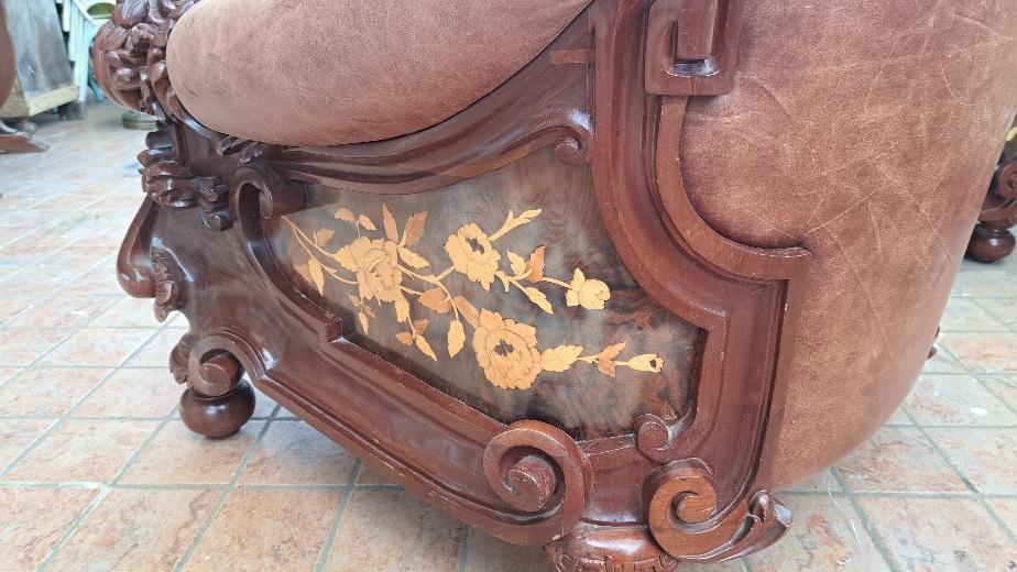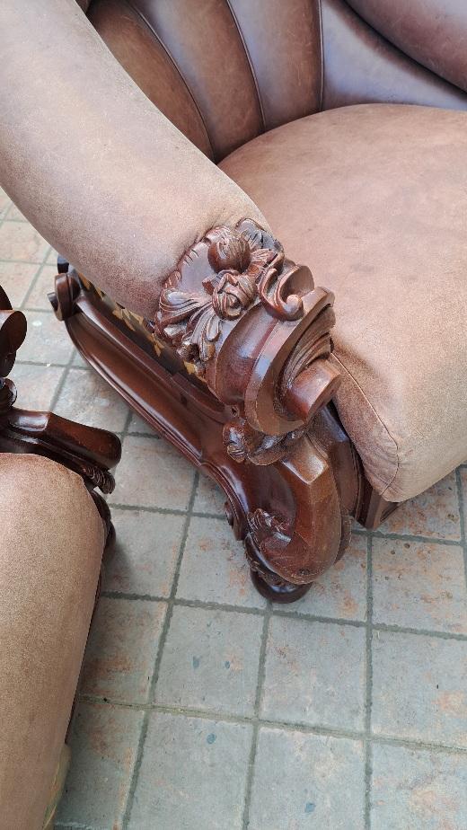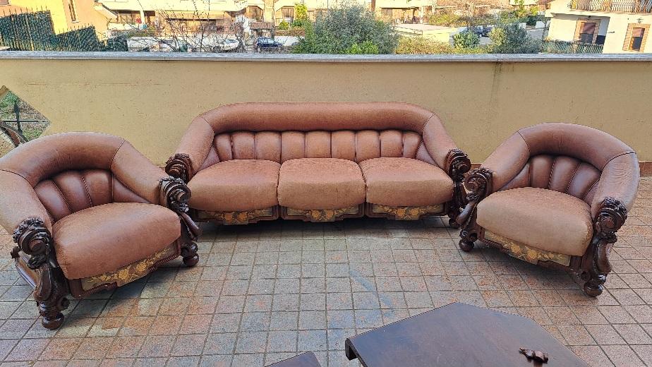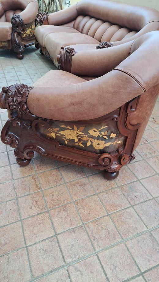 Spettacolare salotto italiano anni 70 in massello di mogano, riccamente intarsiato e intagliato a motivi floreali. Sedute in pelle color cuoio. Il divano misura 210x90 altezza 75 ,le poltrone misurano 90x90 altezza schienale 75