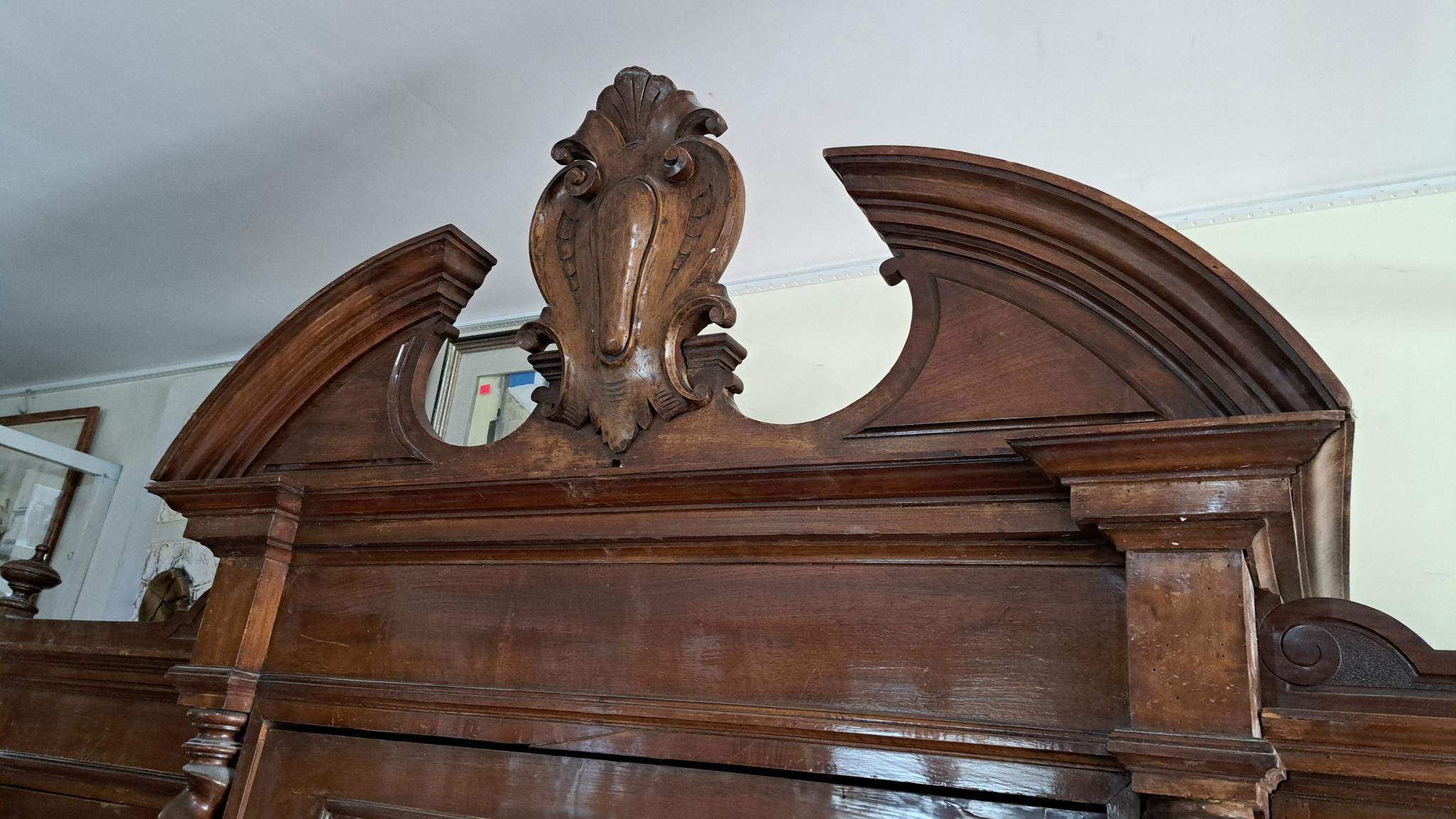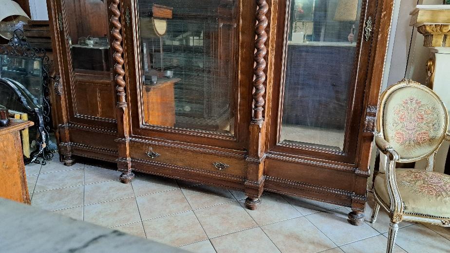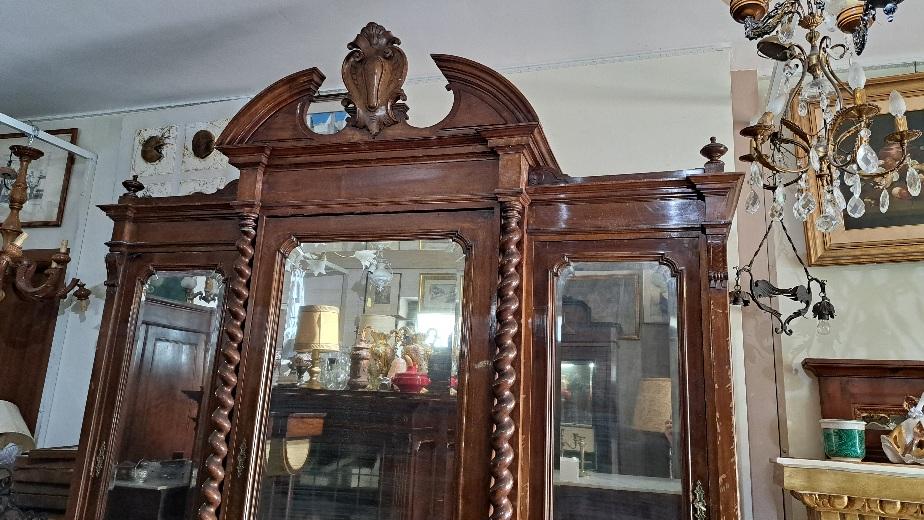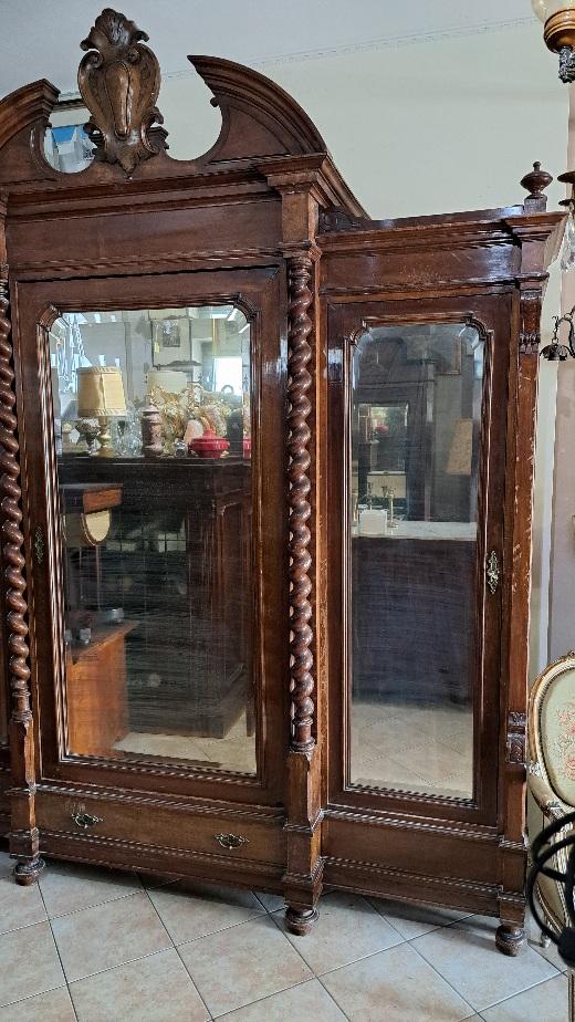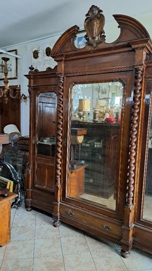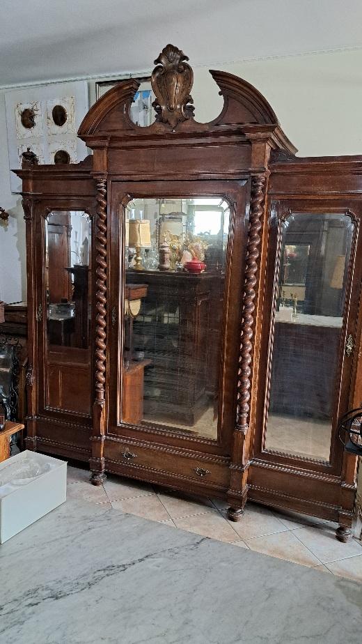 Importante armadio italiano metà 800 in stile Neorinascimentale. Il mobile presenta 3 ante con specchi molati originali. La cimasa è arricchita da uno scudo in legno intagliato ( possibilità di eliminare la cimasa senza modificare la struttura). Cassetti e ripiani interni. Frontale con colonne a torciglione. Misura 240x65 altezza laterale 240 altezza cimasa punto massimo 290