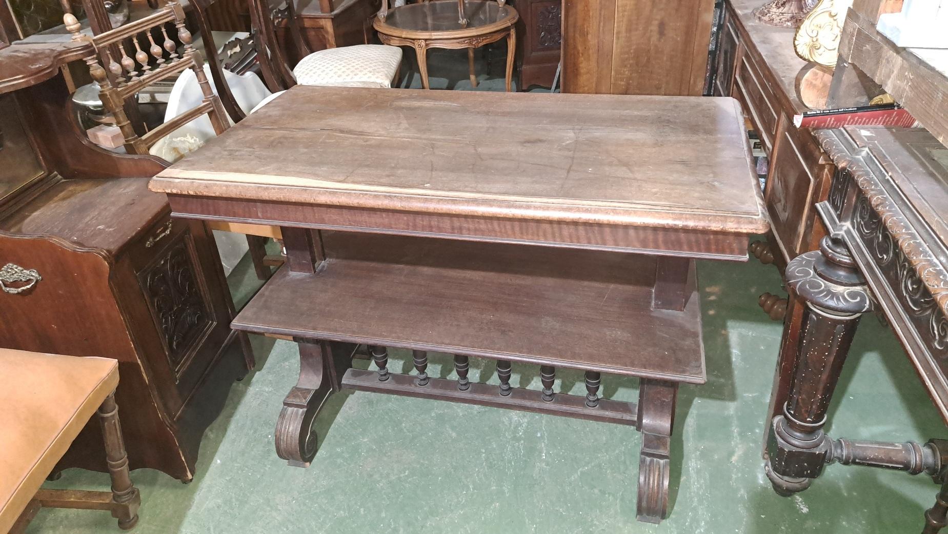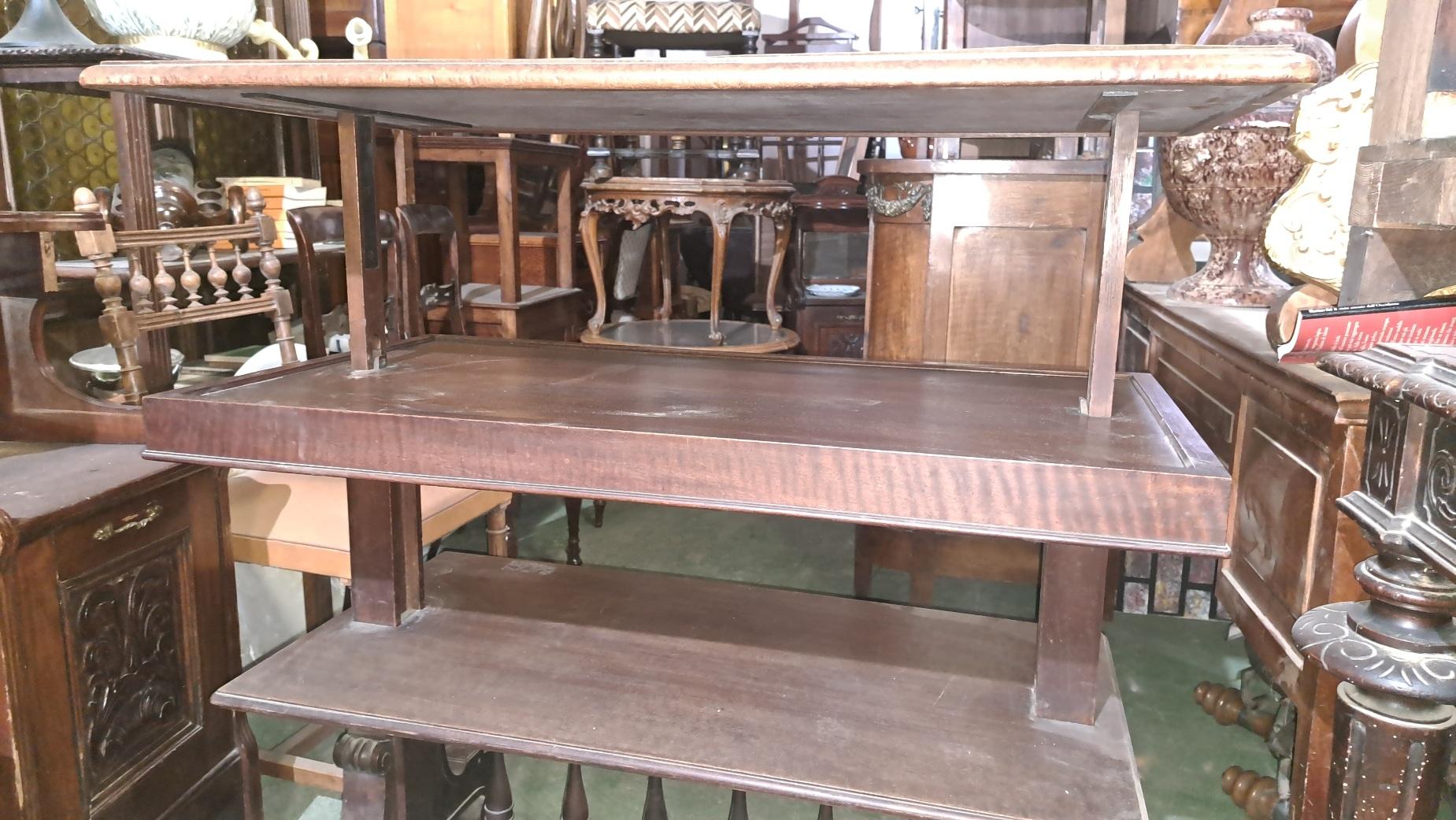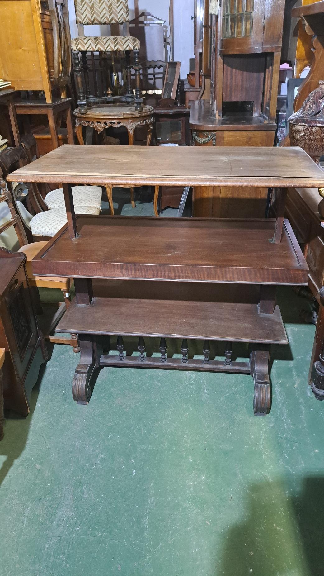 Tavolino porta vivande in noce Luigi Filippo metà 800 . Chiuso si presenta a 2 ripiani ,poi con il meccanismo alza-abbassa si può utilizzare il terzo ripiano misura 100x55 altezza chiuso 75 altezza aperto 125