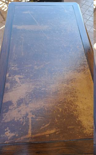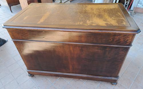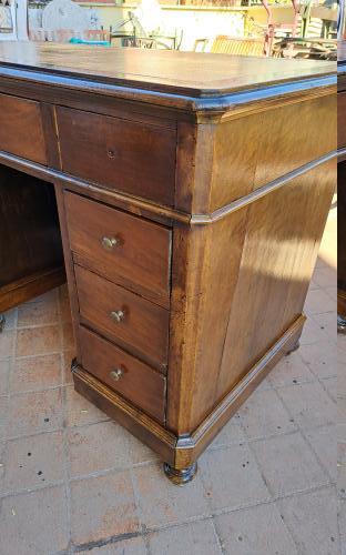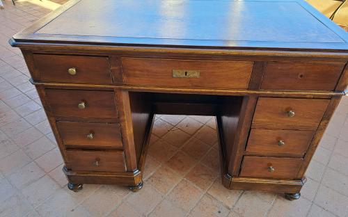 Scrivania italiana in noce primi 900 piano in pelle color cuoio ha 9 cassetti e pomelli in bronzo misura 125×65 altezza 80
