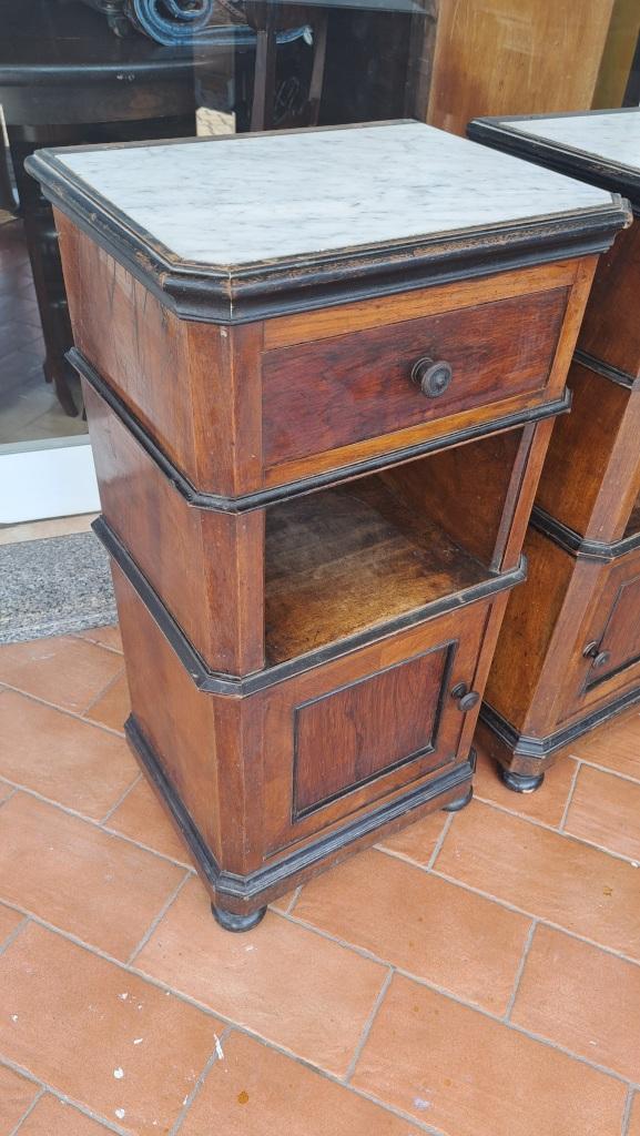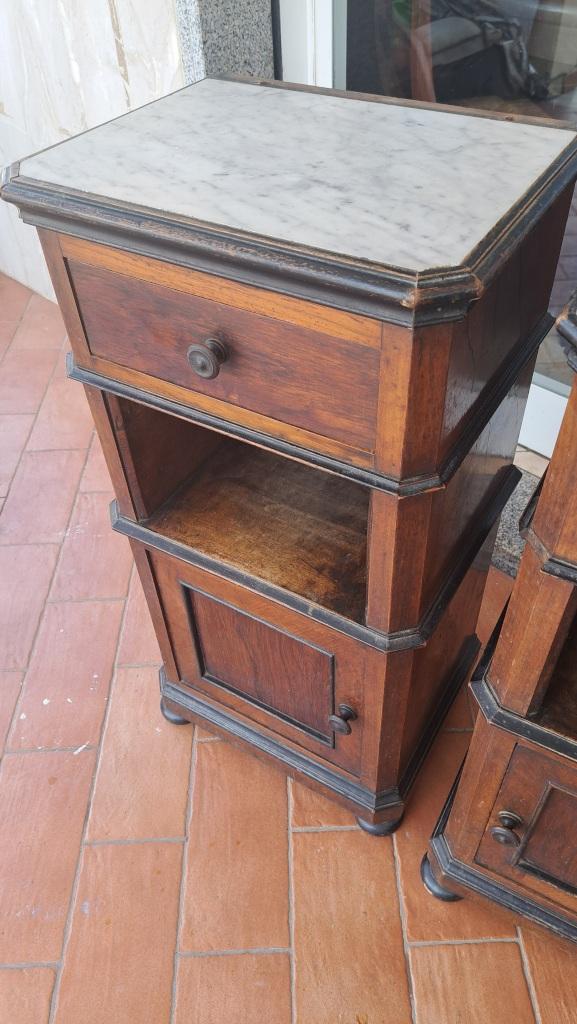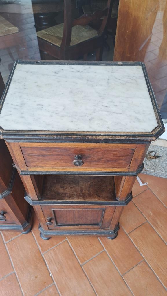 Coppia di comodini italiani fine 800 in noce piano in marmo grigio. Disponibilità di tutta la camera da letto completa di como armadio e letti. Misura comodini 45x34 altezza piano 87