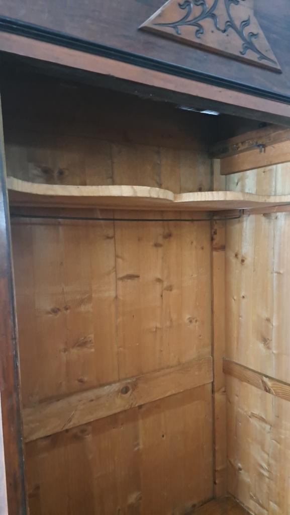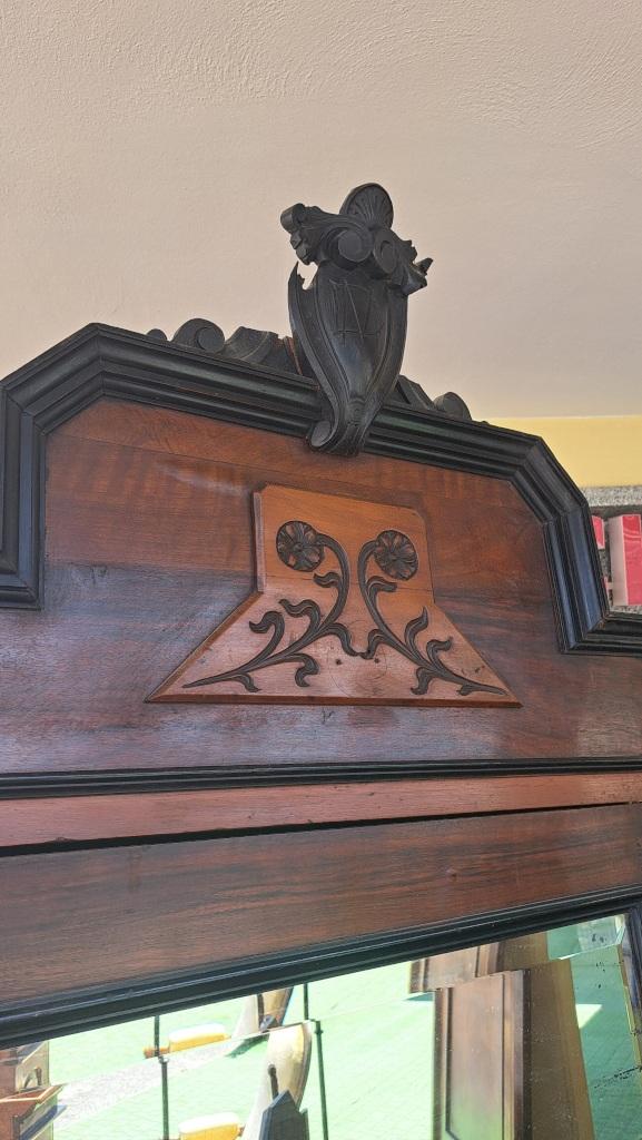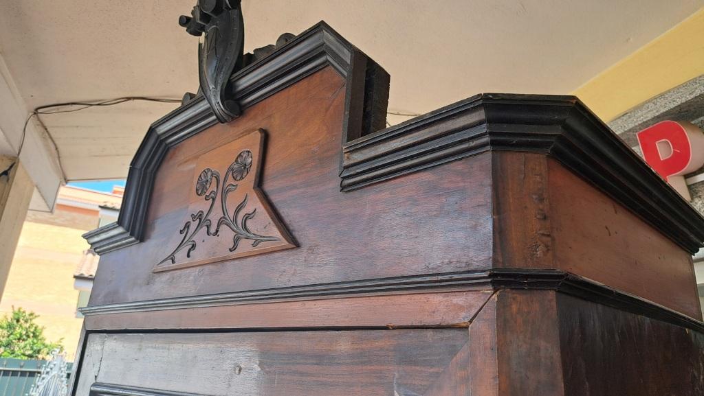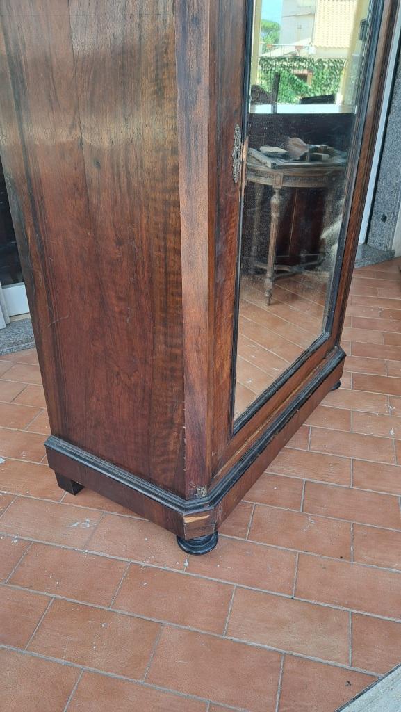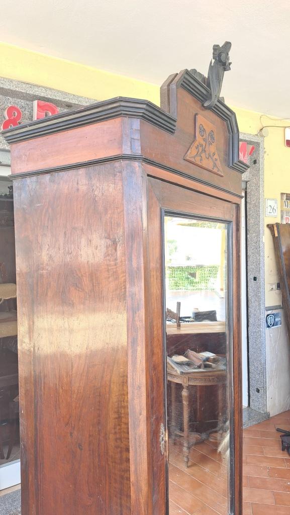 Armadio italiano fine 800 in noce con cimasa . L armadio ha 1 anta a specchio e casetta interno. Sempre internamente è dotato di ripiano e asse appendiabiti. Misura 115x63 altezza punto massimo 225
