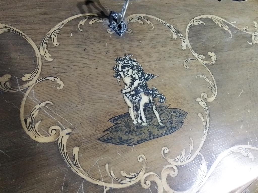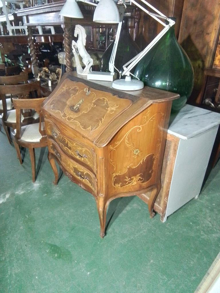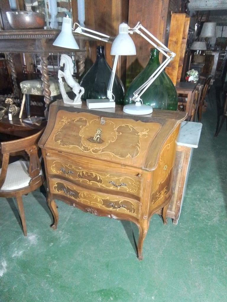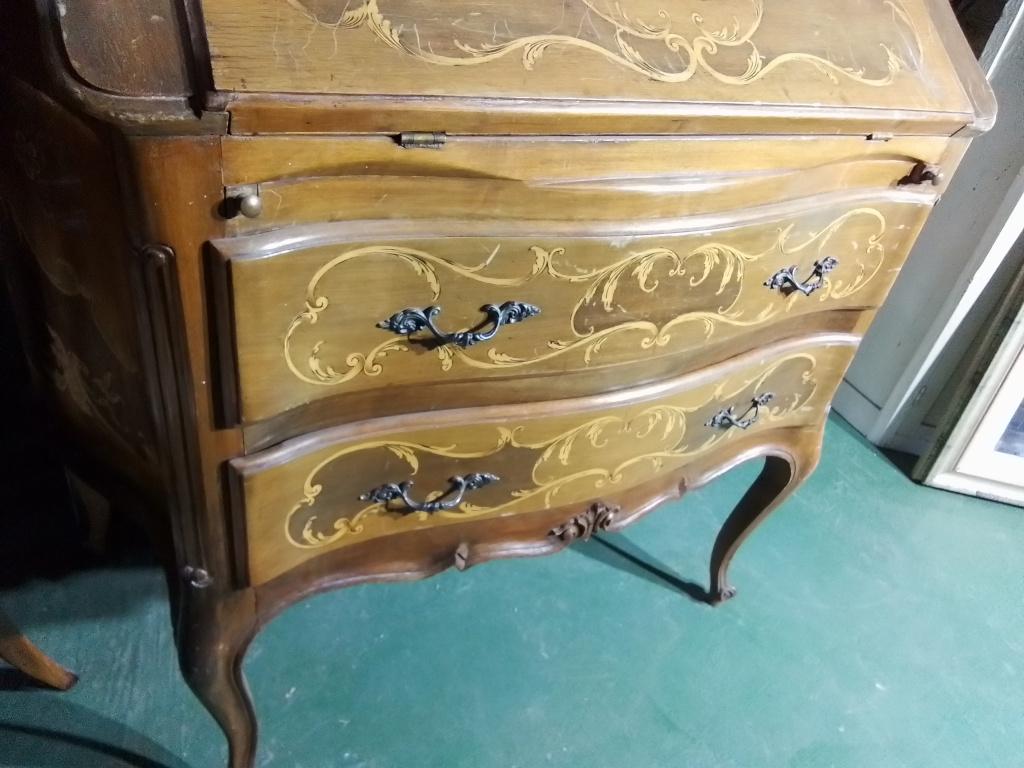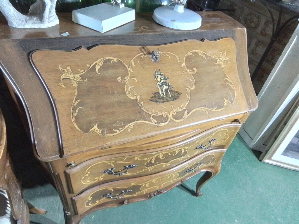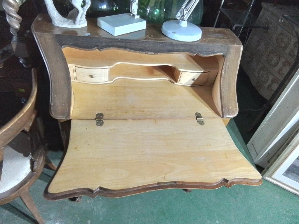 Ribaltina italiana anni 50 in noce con intagli in nocciolo e inserti decorativi in osso interni in faggio bianco naturale stile Barocchetto / Luigi XV.