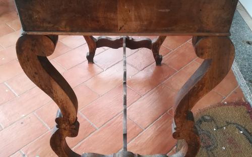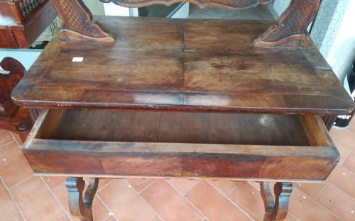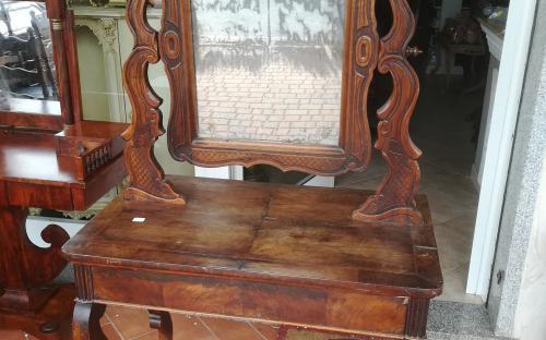 Toletta Spagnola prima metà dell'ottocento con piede fratino in noce due fenici sostengono lo specchio originale cassetto centrale misura 83-48 H 165 - Periodo impero con influenza baroccheggiante locale.