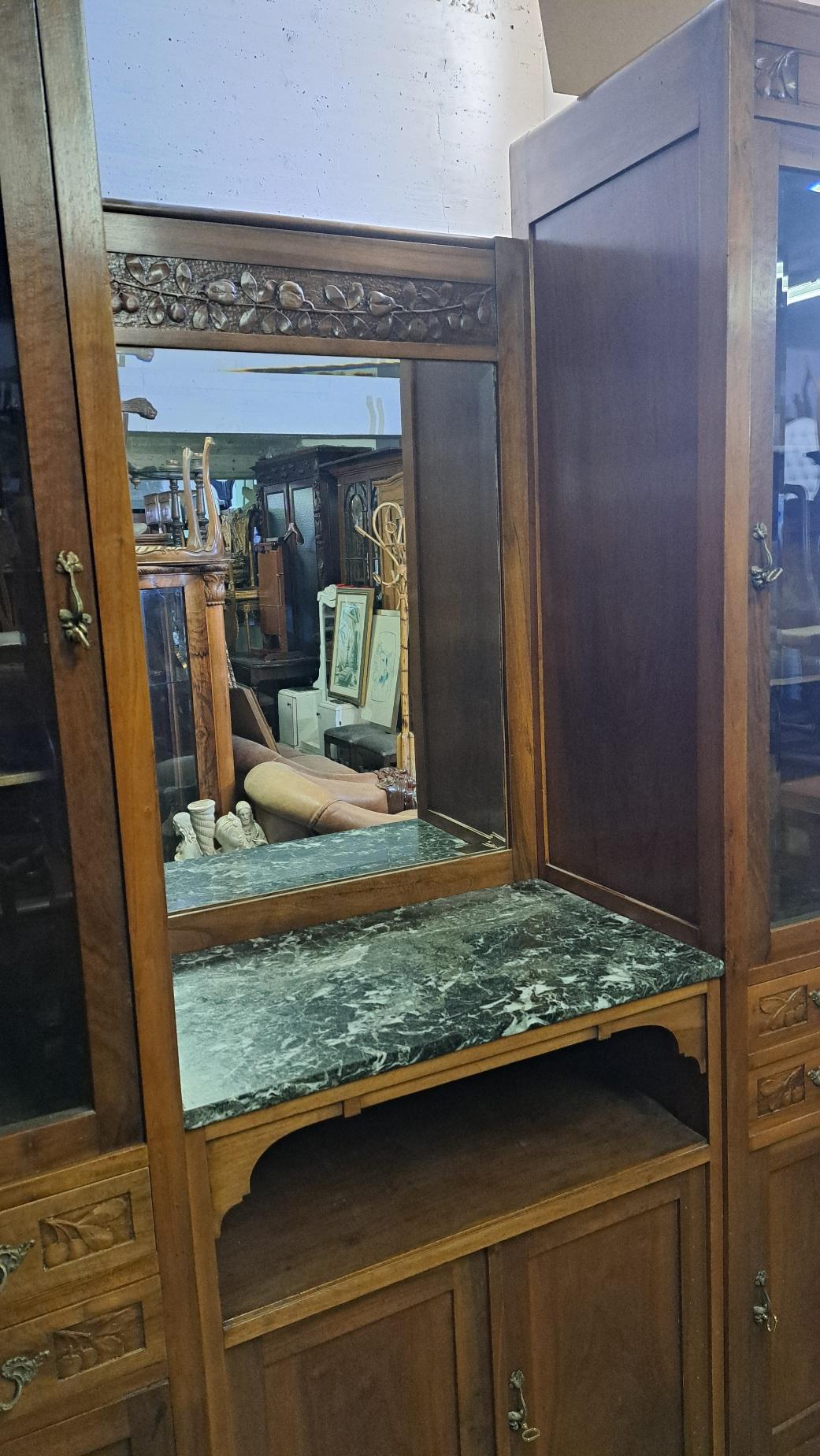 La parte centrale ha il piano in marmo verde con uno specchio con fascia decorativa caratteristica dello stile liberty